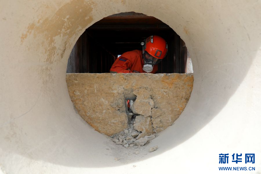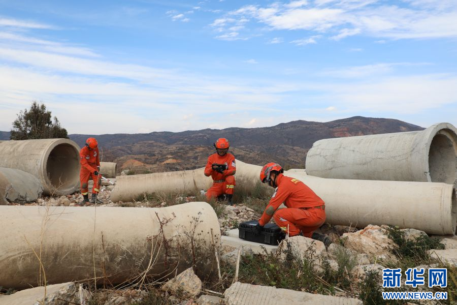 演练中,消防救援人员正在进行生命迹象搜索(2月19日摄)。新华网发(陈胜瑶 摄)