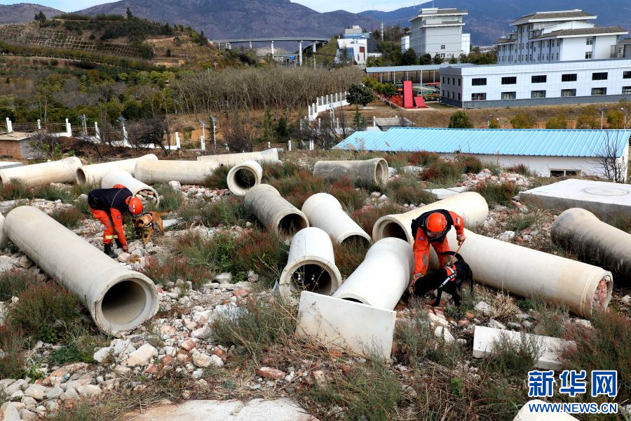 演练中,搜救犬正在搜寻“被困群众”(2月19日摄)。新华网发(陈胜瑶 摄)