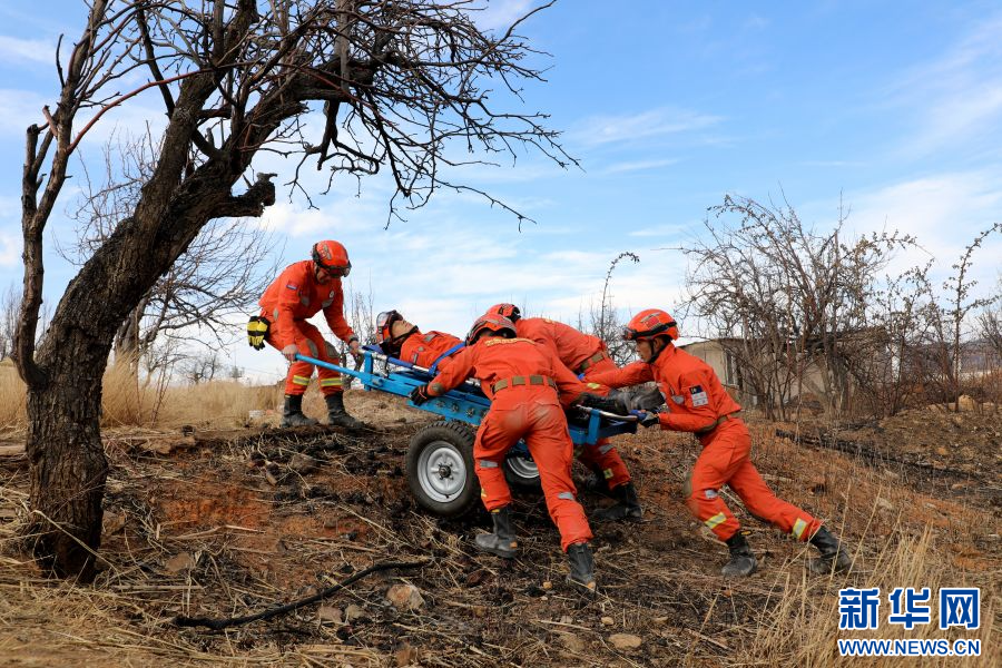 演练中,消防救援人员携带重型救援装备向“灾情点”前进(2月19日摄)。新华网发(陈胜瑶 摄)