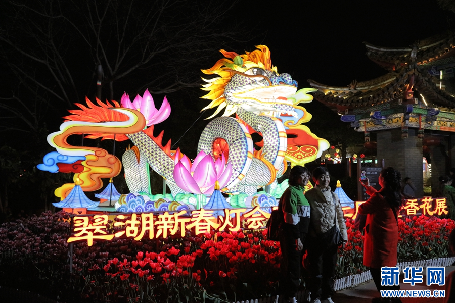 2月21日晚,翠湖公园里灯光璀璨。新华网发 (丁凝 摄)