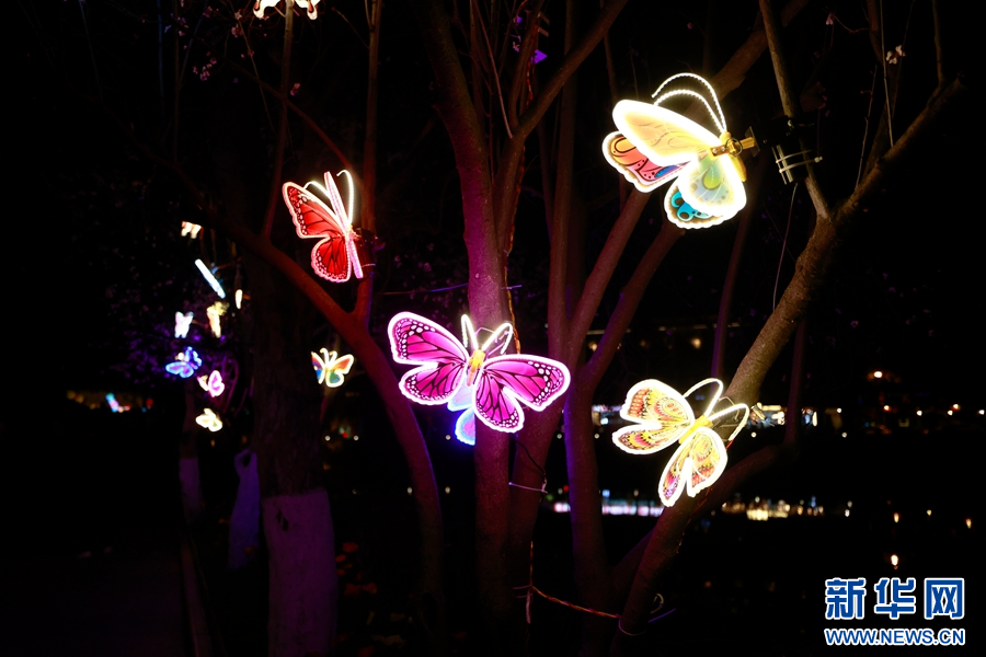 翠湖公园里,一条灯光长廊上装饰的蝶形氛围灯(摄于2月21日)。新华网发 (丁凝 摄)