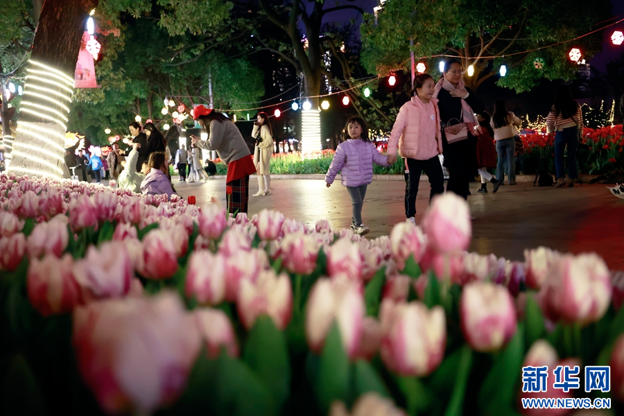 除了异彩纷呈、争奇斗艳的花灯,翠湖公园里同期还举办了郁金香花展,并设置了多条星光夜市。花灯璀璨、花海烂漫,吸引了众多游客的到来。