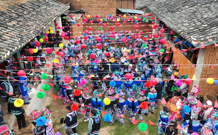 航拍镜头下,村庄周围开满擦木花(2月20日摄)。新华网发(唐应平 摄)