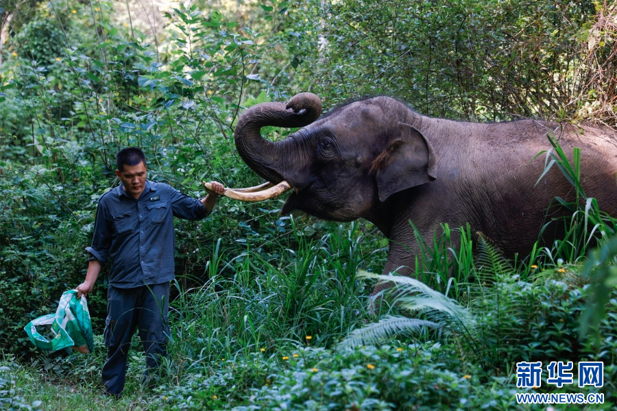 “象爸爸”邬绍能陪伴“小强”进行野化训练(2023年11月5日摄)。新华网发(刘云 摄)