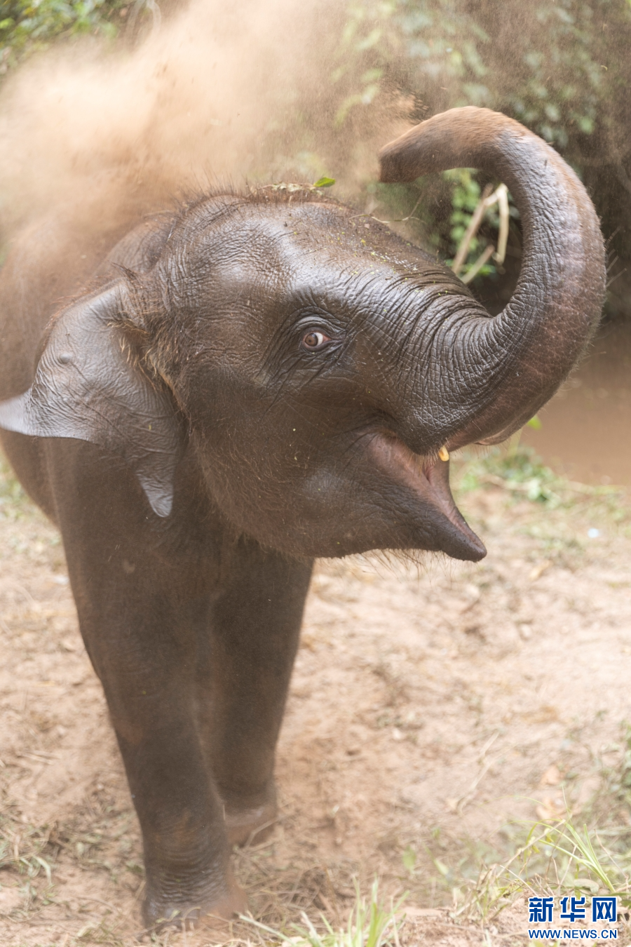小象“龙龙”喜欢躺在地上打滚玩耍(2023年11月5日摄)。新华网发(刘云 摄)