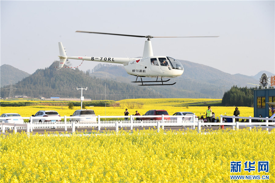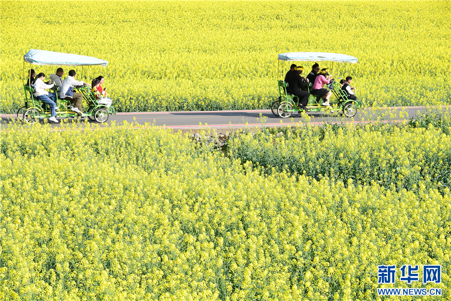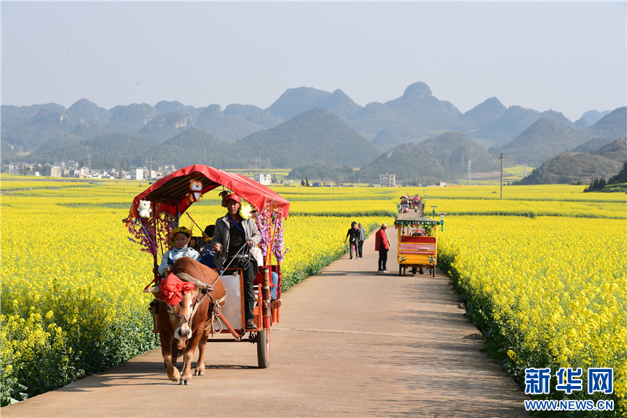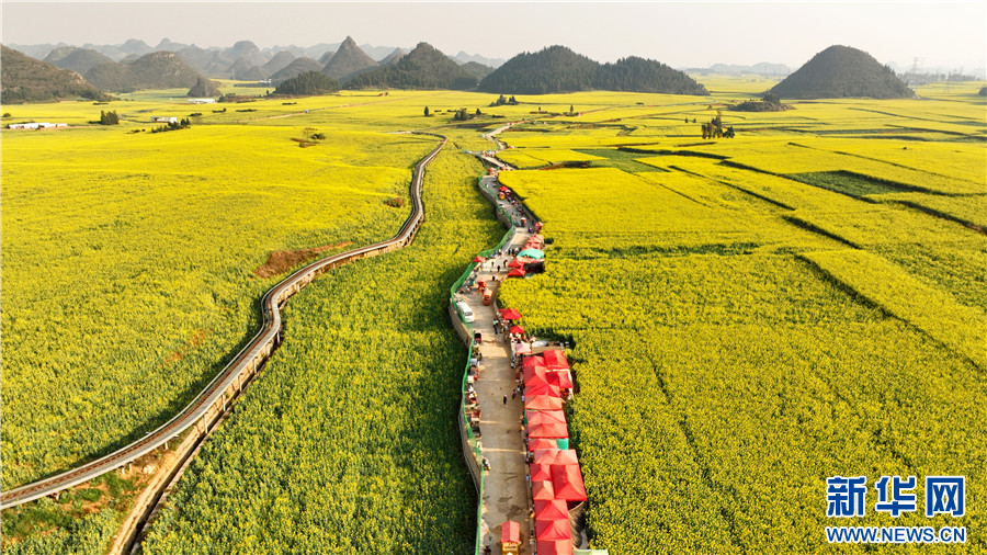 近日,云南省曲靖市罗平县近百万亩油菜花竞相绽放,微风吹过,油菜花海泛起黄色波浪,与峰林、村庄、树林相映成趣,勾勒出美丽春色,吸引了大量游客前来赏花游玩。近年来,罗平县将油菜产业与文旅产业深度融合,带动乡村餐饮、民宿等蓬勃发展,助力乡村振兴。新华网发(毛虹 摄)