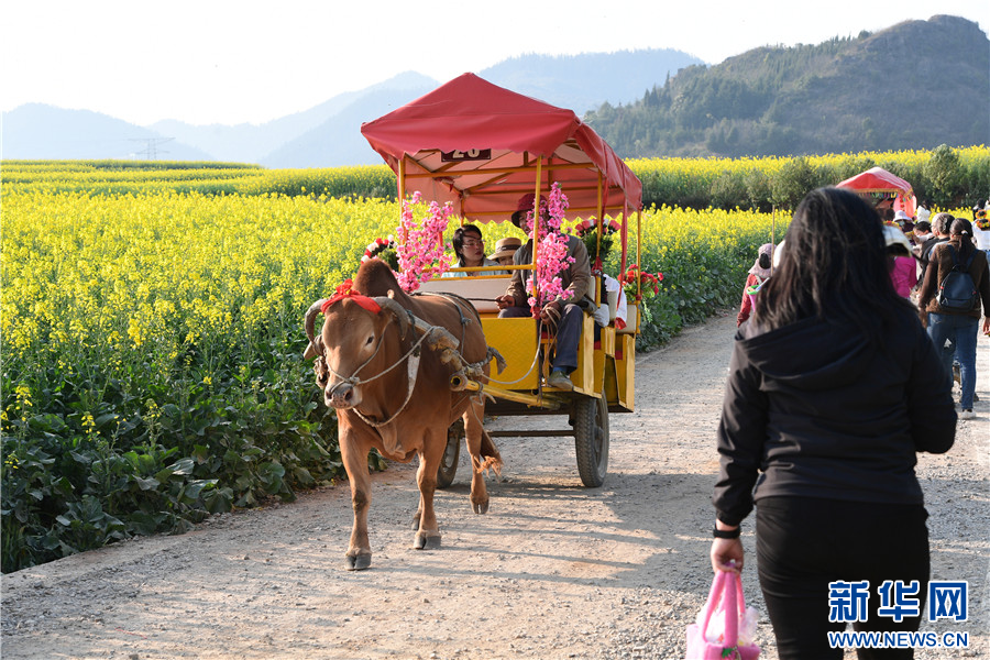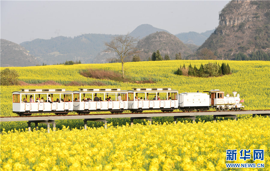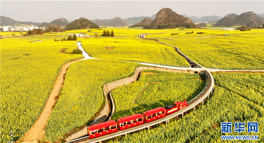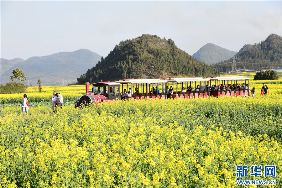 游人在云南省罗平县乘坐小火车穿越油菜花海(2月20日摄)。新华网发(毛虹 摄)