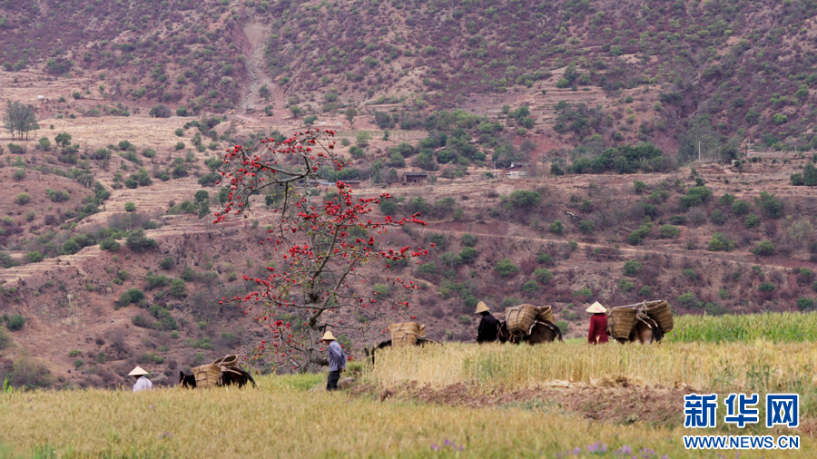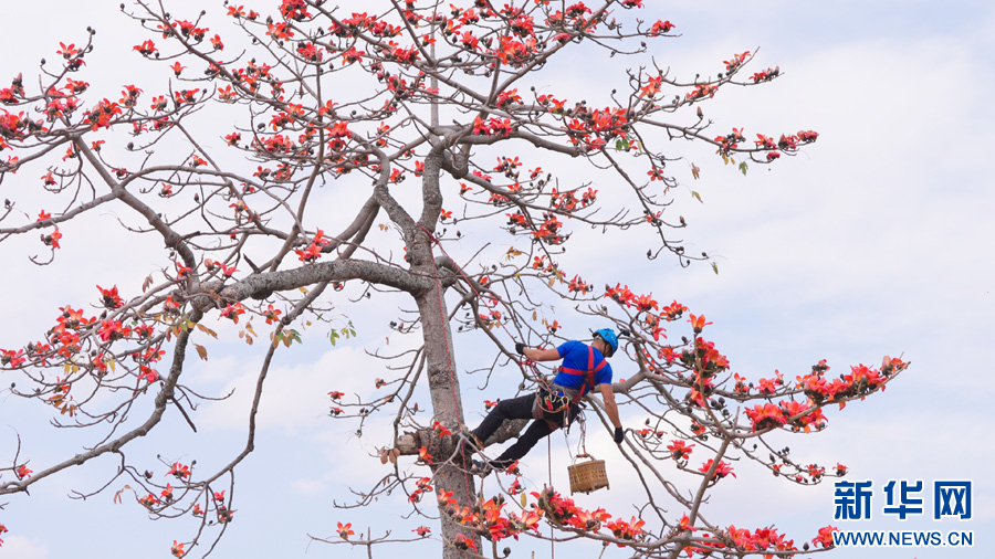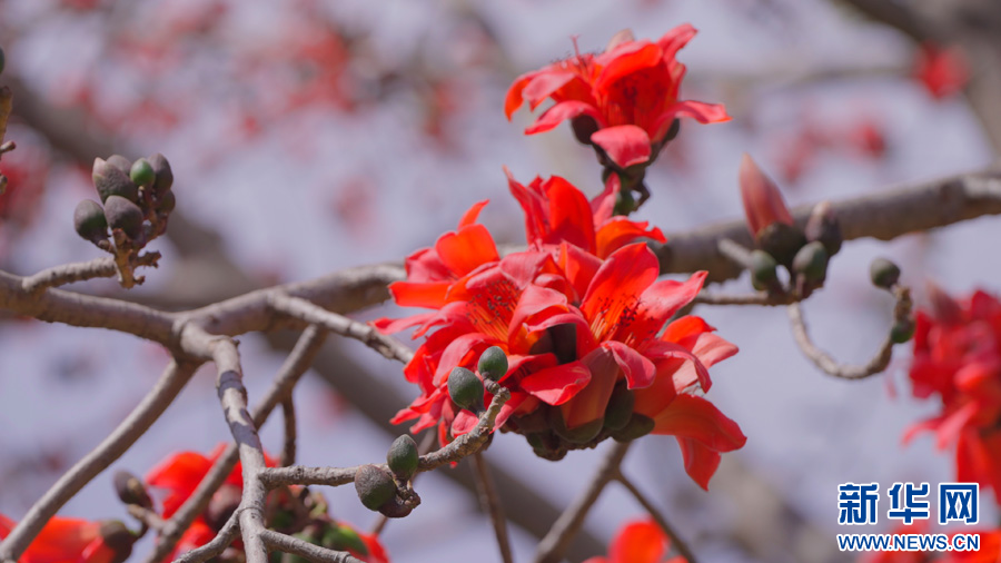早春时节,在云南省楚雄彝族自治州武定县己衣镇,山岭间攀枝花开得红红火火。攀枝花也称木棉,每年一月份开花,花期可以延续到四月份。攀枝花不仅可观赏,还可做菜,凉拌攀枝花不仅口感好,还清热利湿,是当地一道不容错过的美食!(武学成 余林强)