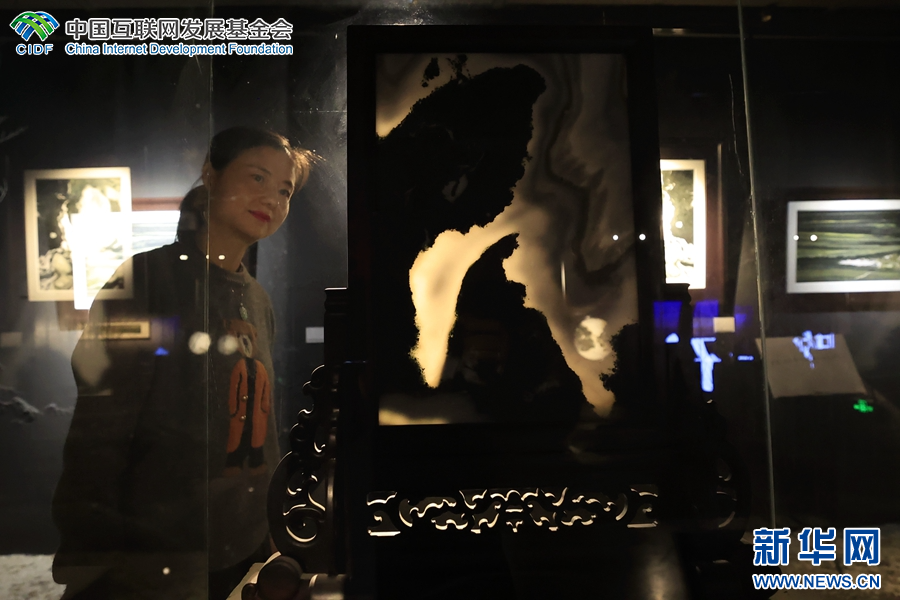 大理石方志馆里,一名游客正在观赏大理石画(摄于4月3日)。(新华网 赵普凡 摄)