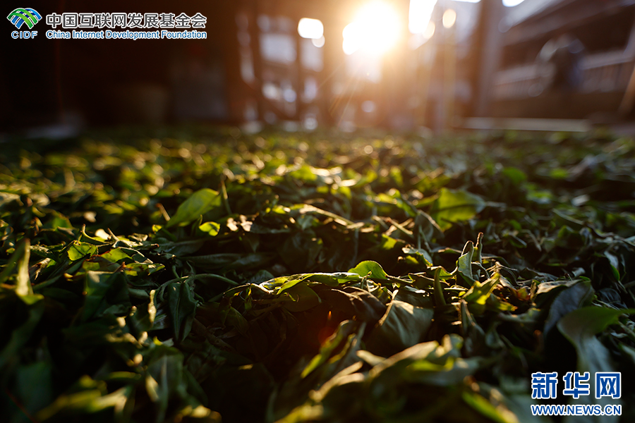 云南普洱翁基古寨,落日余晖洒在晾晒的茶叶上(4月1日摄)。新华网发(徐华陵 摄)