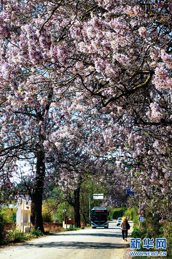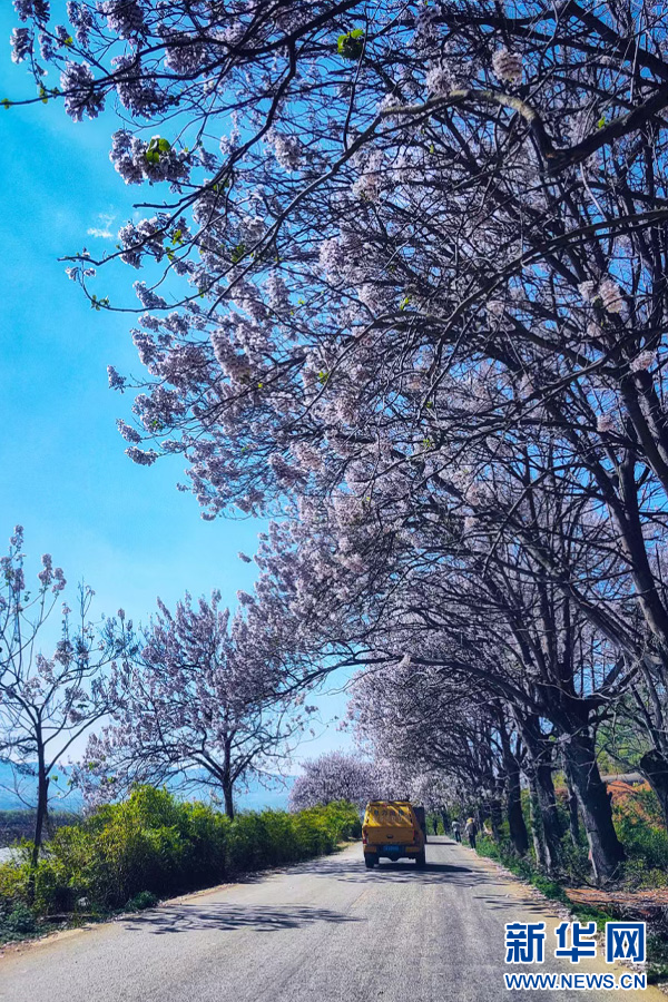 近日,在云南省安宁市,公路两旁的泡桐花悄然盛放,一簇簇淡紫色的花朵簇拥枝头,微风拂过,似风铃一般的花朵随风舞动。长约两公里的淡紫色花海,点缀着车来车往的乡村公路。(完)(安宁市融媒体中心)