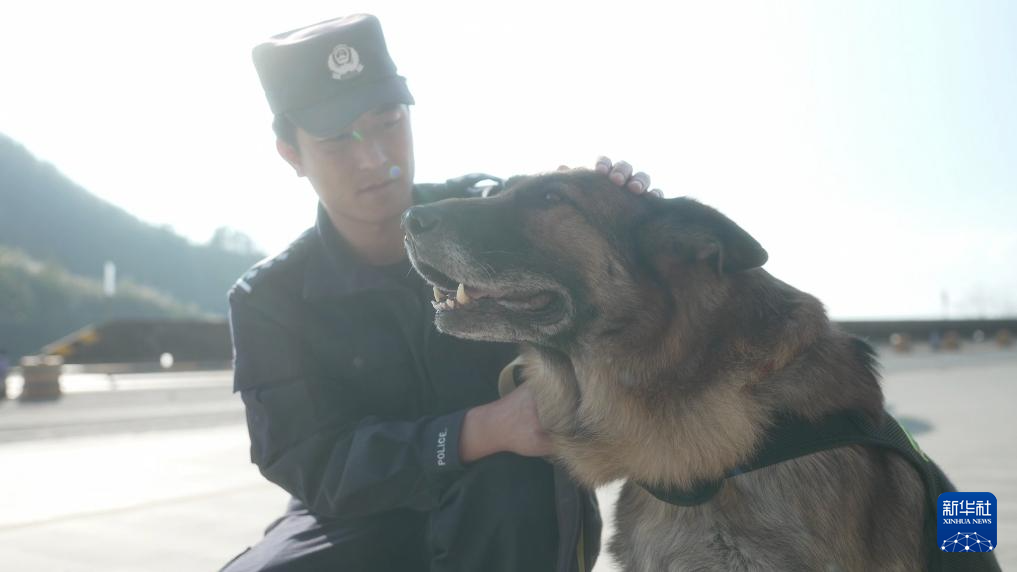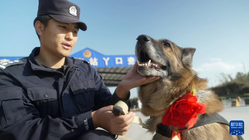 近日,云南出入境边防检查总站红河边境管理支队蛮耗边境检查站警犬“龙虎”迎来了退役的日子,战友们为它举行了庄重的退役仪式,“后辈”警犬为它衔来大红花。