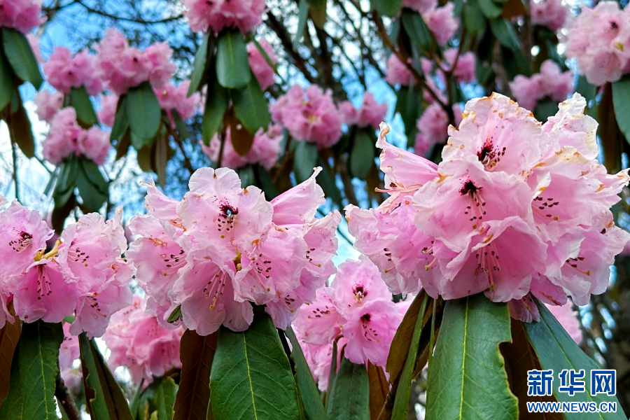 蓝天白云下的高山杜鹃花绽放(4月8日摄)。新华网发(剑川县融媒体中心供图)