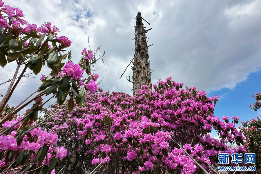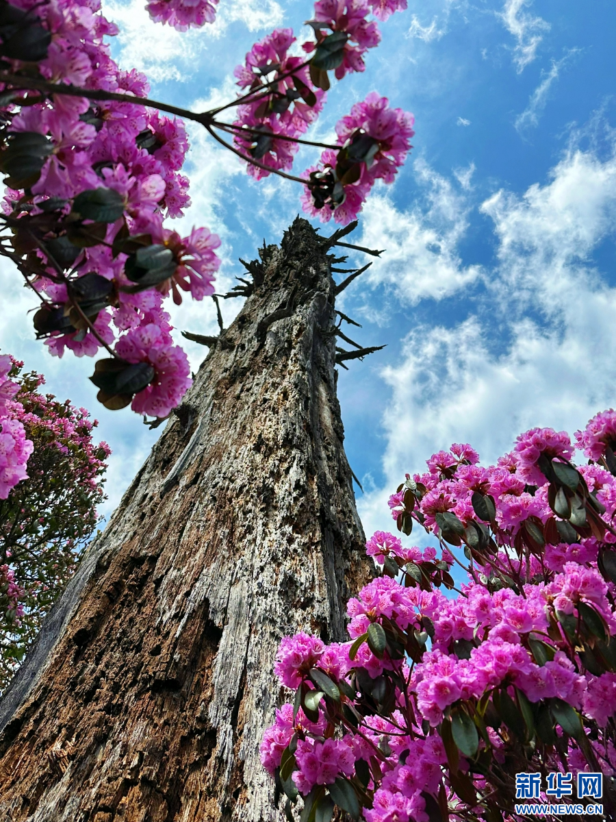 高山杜鹃花与枯木相映成景(4月8日摄)。新华网发(剑川县融媒体中心供图)