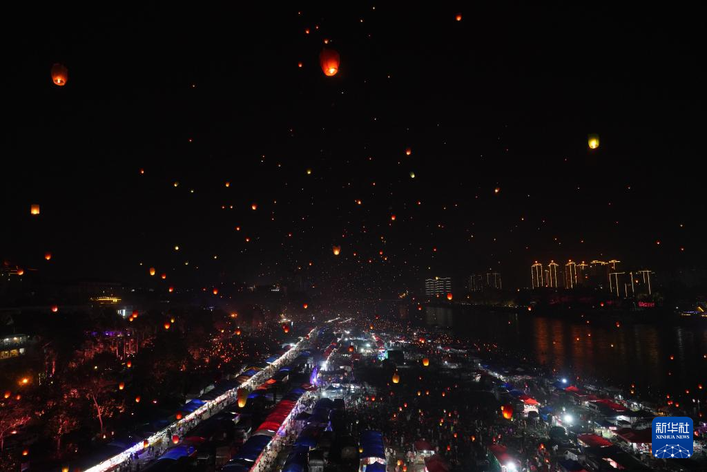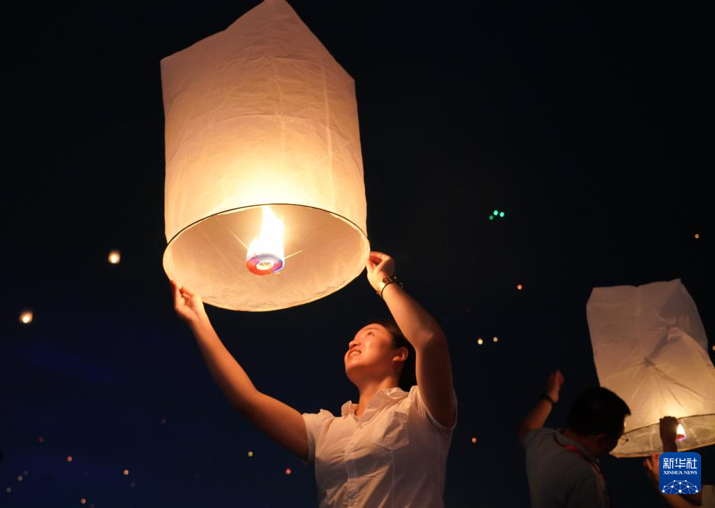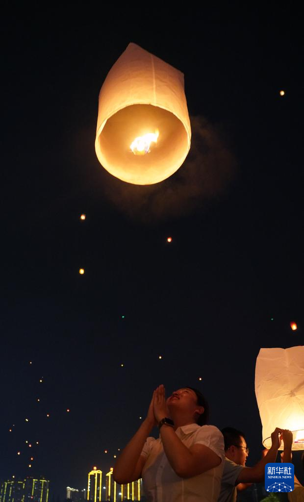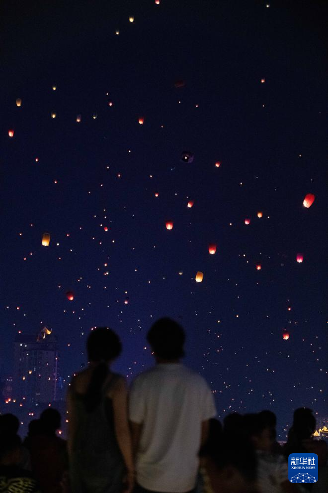 4月13日晚,人们在云南省景洪市澜沧江边放飞孔明灯。新华社记者 王静颐 摄
