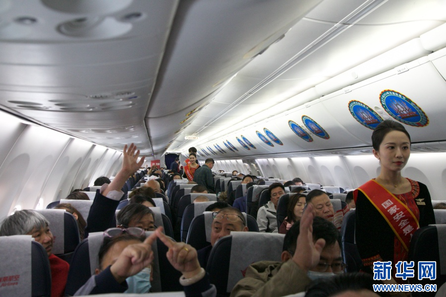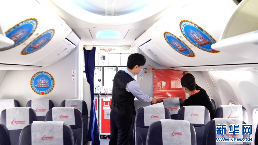 乘务员布置机舱内景(4月11日摄)。新华网发(德宏州融媒体中心供图)