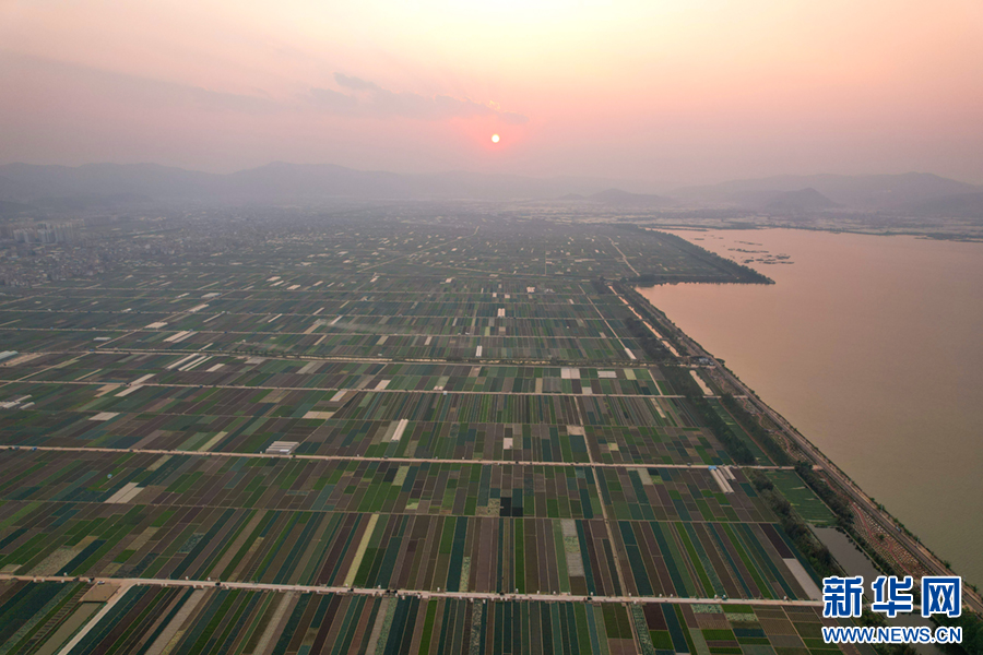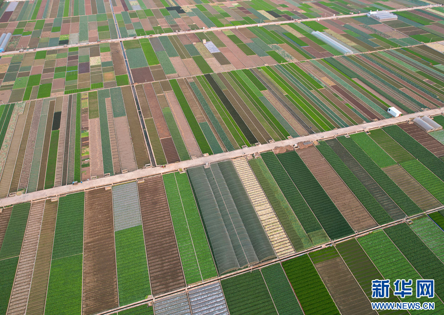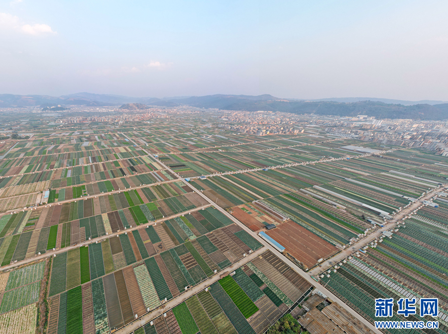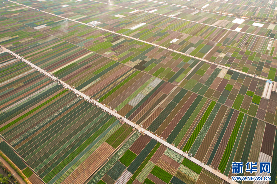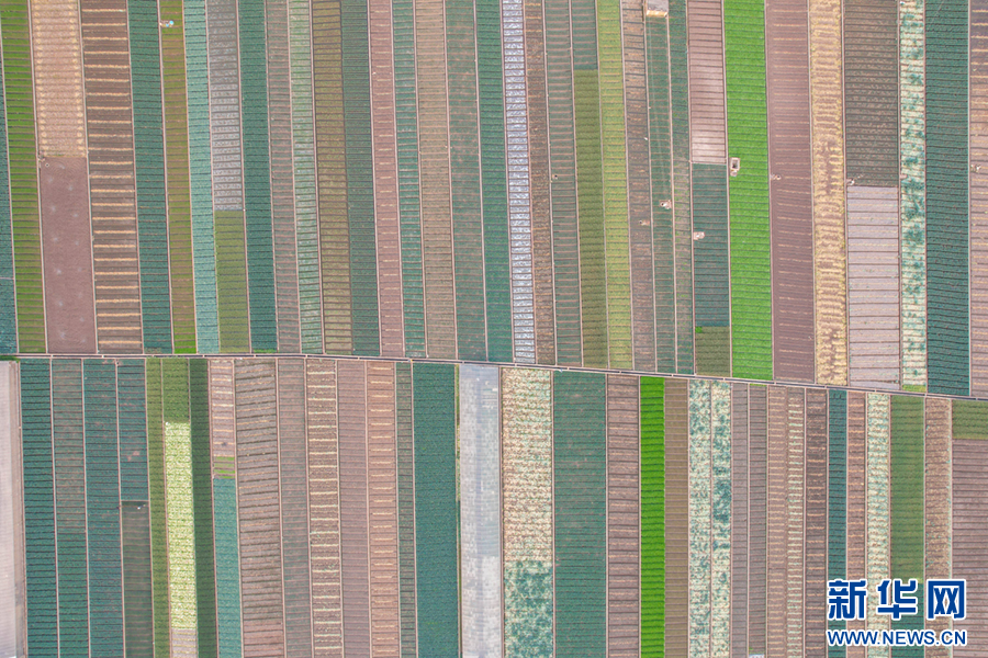 暖春时节,云南省玉溪市通海县蔬菜种植基地,压茬轮种的各类蔬菜长势喜人,平整规范的土地阡陌纵横、色彩斑斓,与村庄、山峦、湖泊构成一幅美丽的田园画卷。新华网发(杨俊鹏 摄)