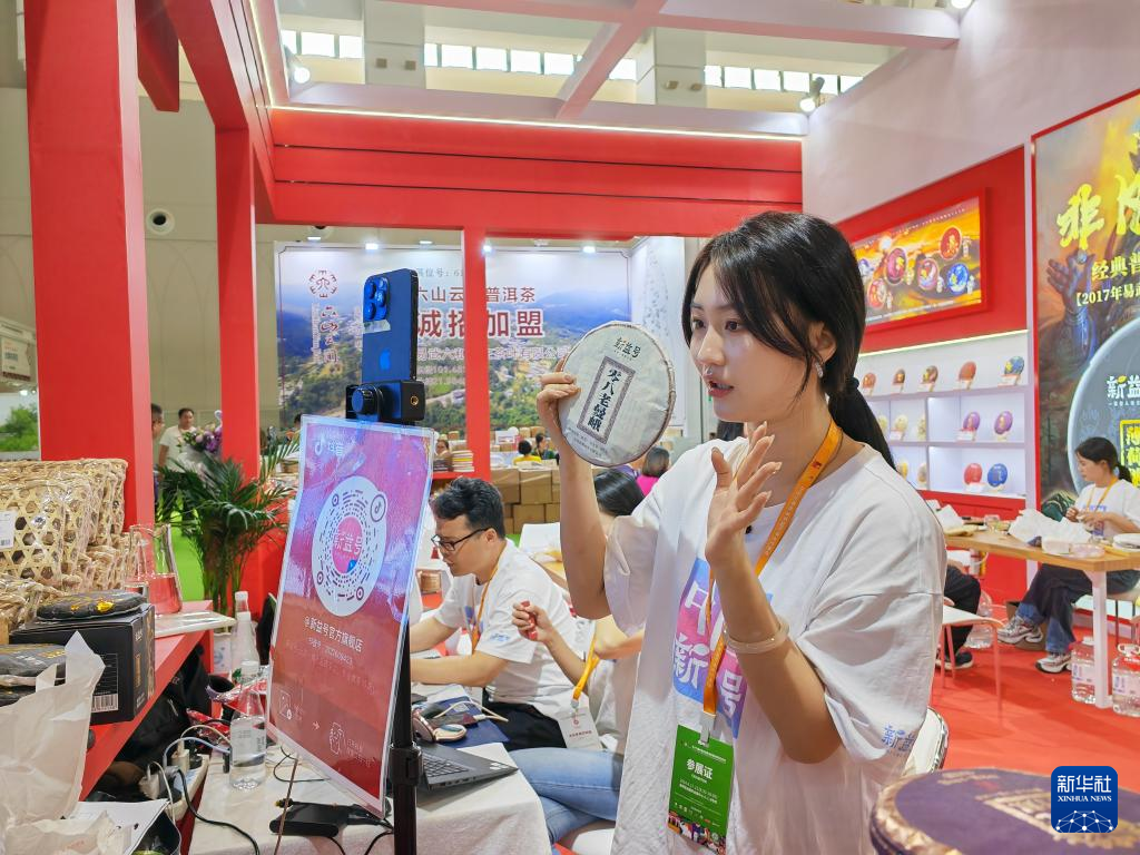 4月19日,参展商工作人员在第十六届中国云南普洱茶国际博览交易会上进行电商直播。新华社记者 林碧锋 摄