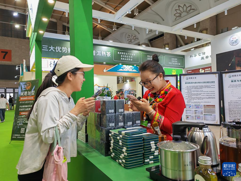 4月19日,参观者在第十六届中国云南普洱茶国际博览交易会上选购产品。新华社记者 林碧锋 摄