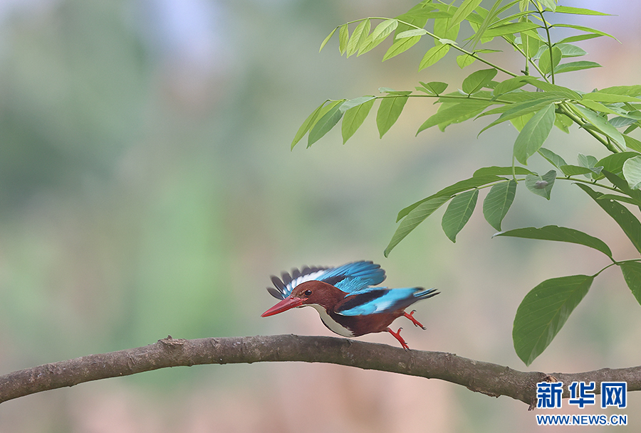 白胸翡翠叼着小鱼去喂雌鸟(4月15日摄)。新华网发(杨学飞 摄)