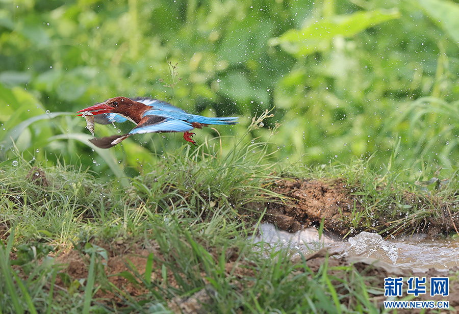 白胸翡翠起飞捕鱼(4月15日摄)。新华网发(杨学飞 摄)