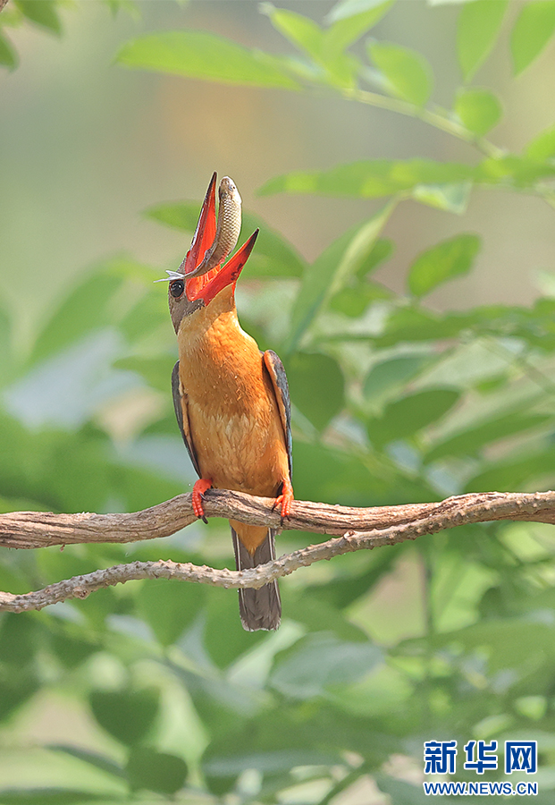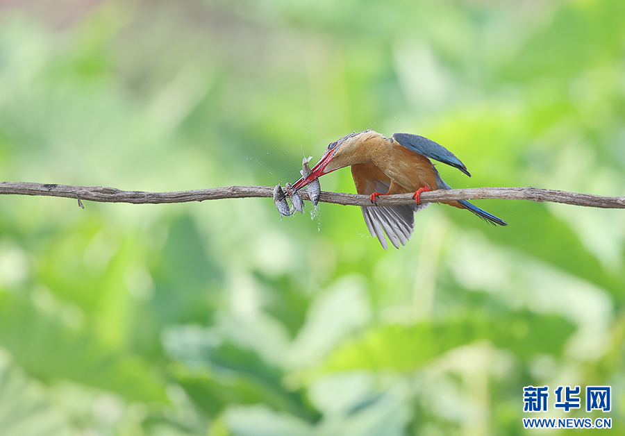 白胸翡翠玩耍小鱼后吞食(4月15日摄)。新华网发(杨学飞 摄)