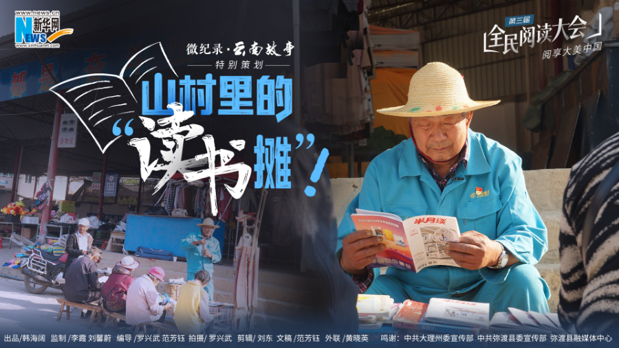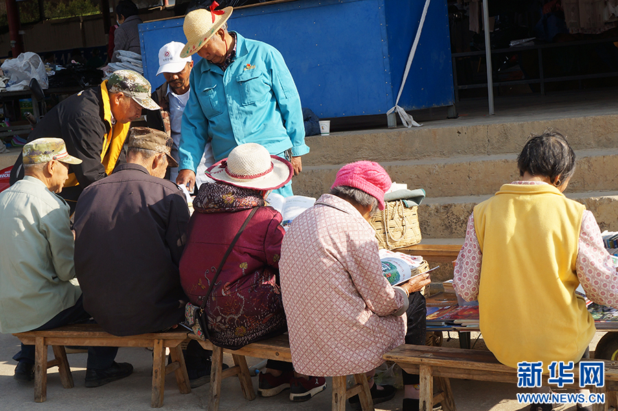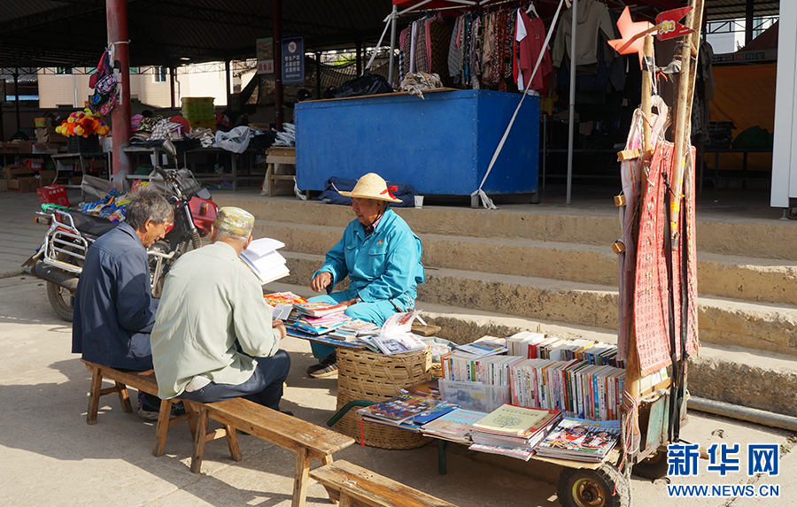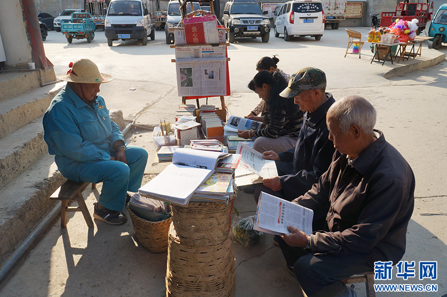 村民围在书摊前看书(4月7日摄)。新华网 范芳钰 摄