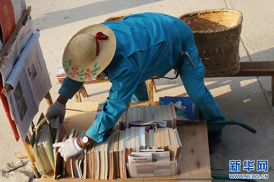 一个多小时后,他换上邮政工作服,从家中拉上小车,去农家书屋带上一百多本图书,开始到小集市“摆书摊”……