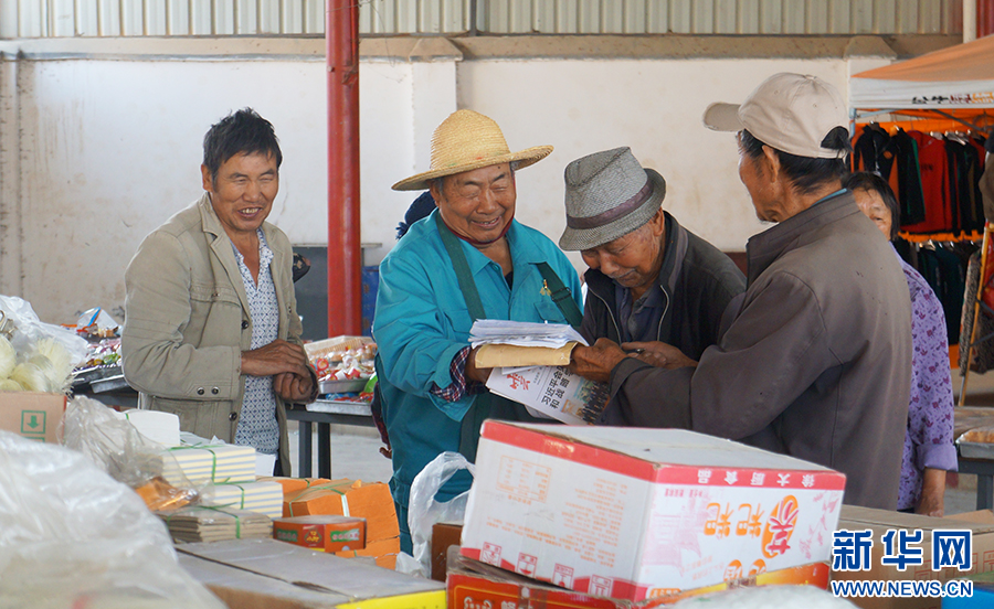 李存德给村民送书(4月8日摄)。新华网 范芳钰 摄