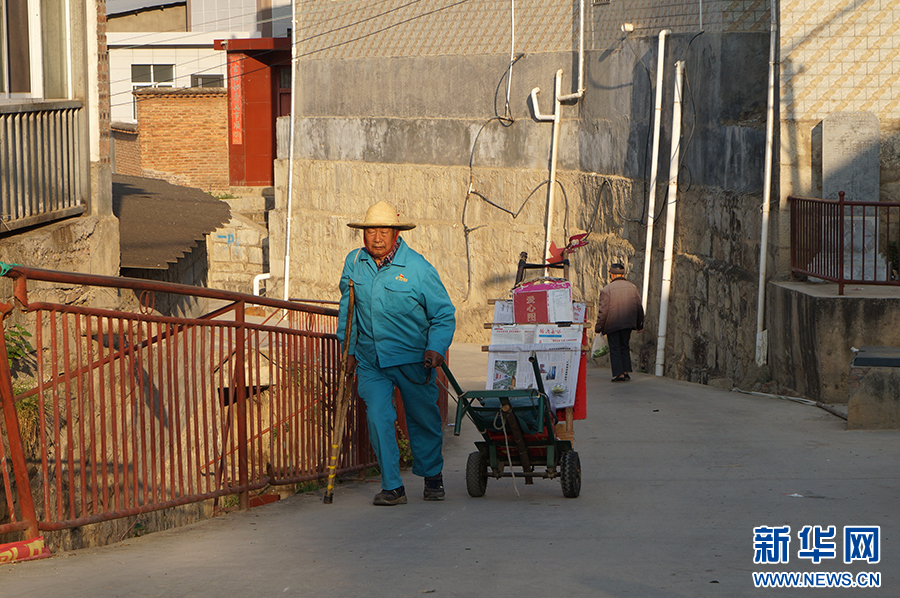 李存德拉着手推车前往农家书屋装书(4月7日摄)。新华网 范芳钰 摄