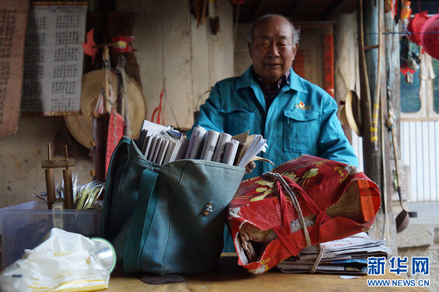 李存德在家里整理报纸(4月7日摄)。新华网 范芳钰 摄