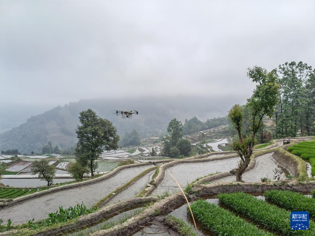 4月9日,元阳县牛角寨镇良心寨村运用无人机进行播种。(叶秉凤 摄)
