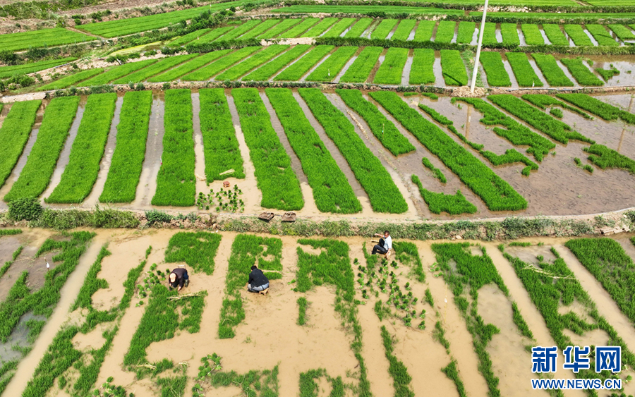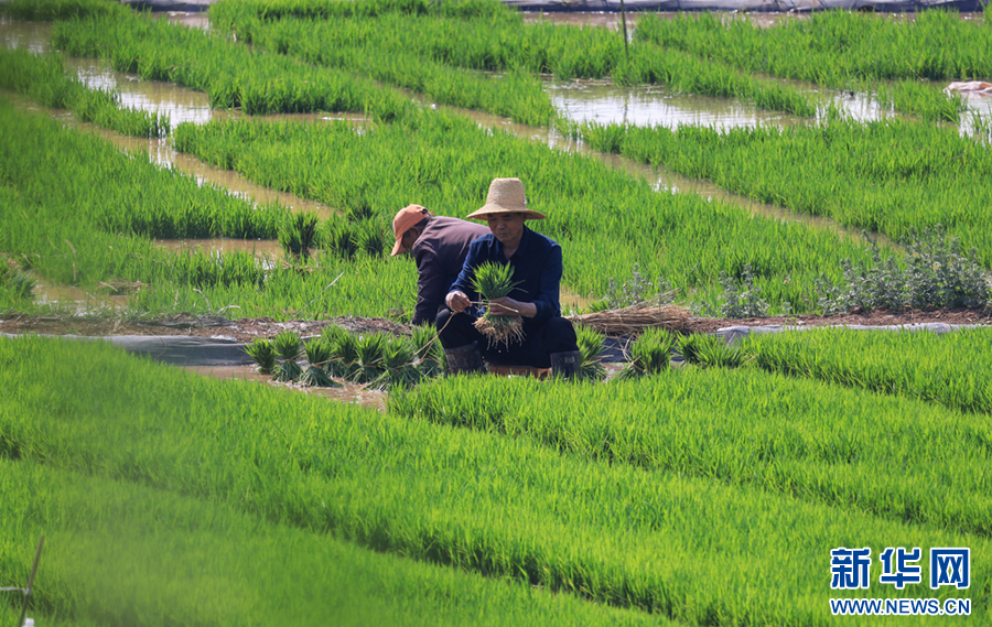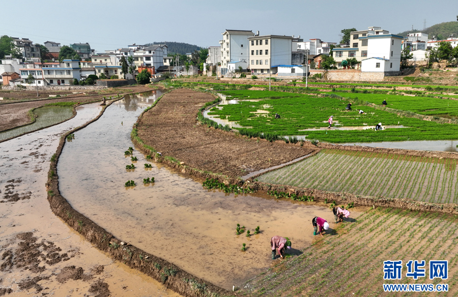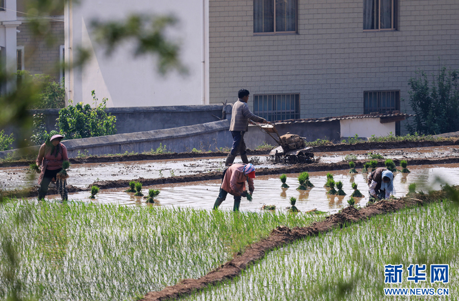 春末,在云南省曲靖市沾益区天生坝村,村民们抢抓农时,翻犁田地、拔秧、插秧,田间地头一派忙碌景象,劳作的村民与翠绿的秧苗共同勾勒出一幅田园劳作图。新华网发(孙文来 摄)