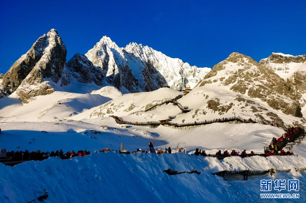雪山巍峨耸立,皑皑白雪映照着蓝天,成为无数徒步爱好者和摄影爱好者的朝圣之地。游客们乘坐缆车,从山下的“春天”到山顶的“冬天”,在冰雪中俯瞰丽江城乡,顿生畅快淋漓之感。
