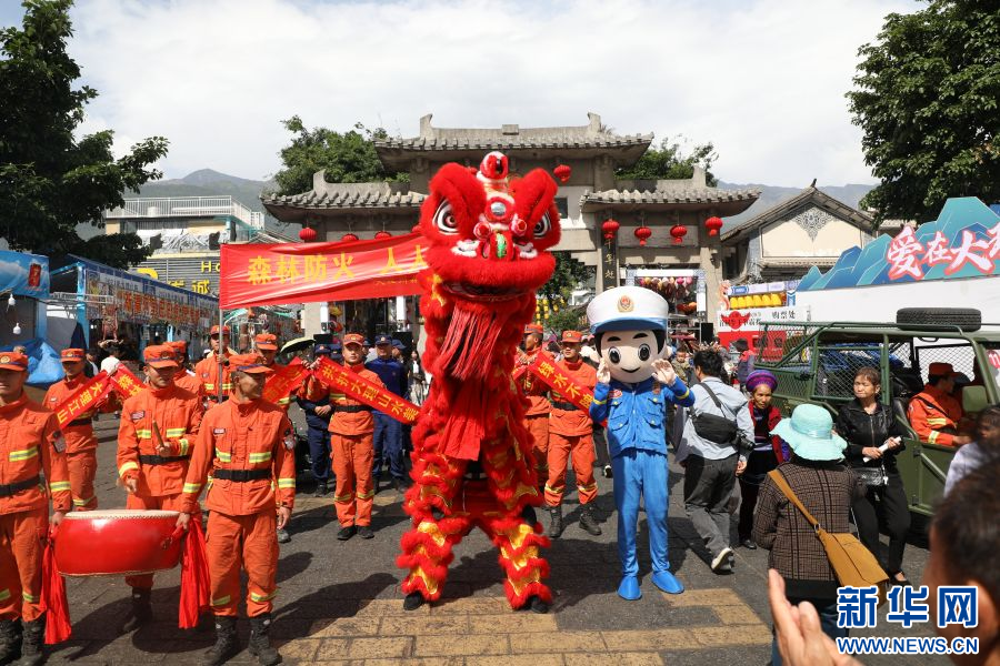 在三月街宣传点,森林消防员利用舞狮等节目吸引游客驻足观看,并通过发放防火宣传单和防火手提袋,普及森林消防法律法规和森林消防基础知识,提高群众预防森林火灾意识,健全群防群控机制。