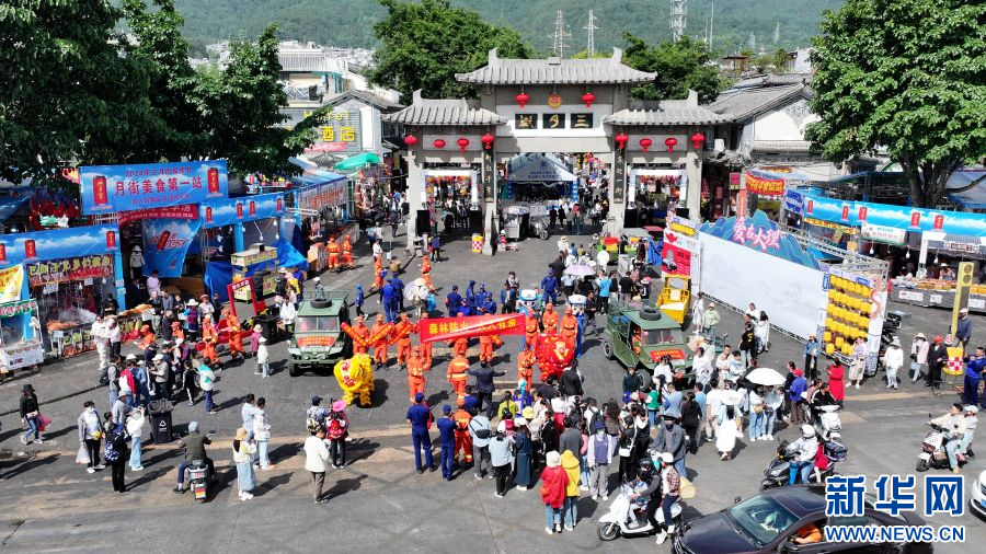 指战员在三月街开展防火宣传(5月2日摄)。新华网发(陈胜瑶 摄)