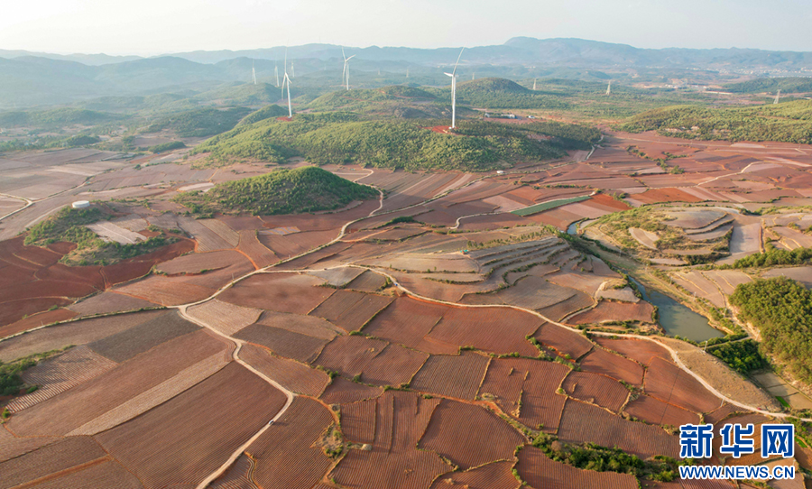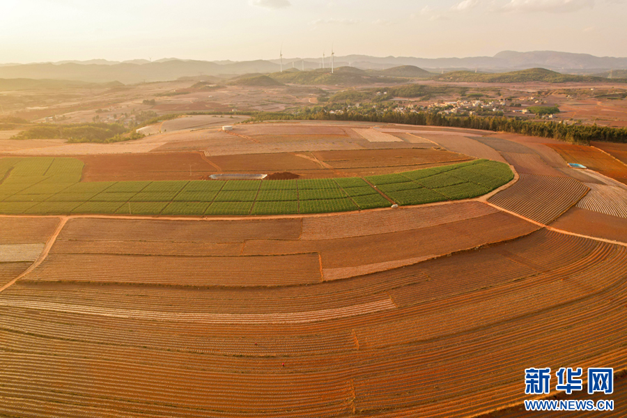 近日,位于滇东高原的云南省曲靖市沾益区的农田里,红土地上开出成行的垄,阡陌纵横,如同写在大地上的道道诗行。空中鸟瞰,红土地与村庄、山峦、风车、夕阳等相应成景,构成了一幅美丽的田园画卷。新华网发(杨俊鹏 摄)