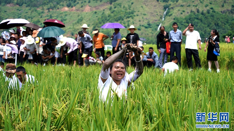 游客体验捉稻花鱼(资料图)。新华网发(龙陵县融媒体中心 供图)