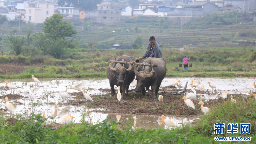 和顺镇农民忙农耕,白鹭来作伴(5月8日摄)。新华网发(龚祖金 摄)