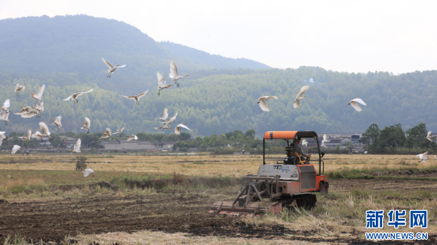 和顺镇农民忙农耕,白鹭在田间飞舞(5月8日摄)。新华网发(龚祖金 摄)