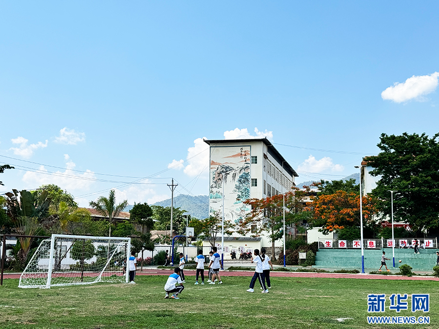 磨憨中学学生正在踢足球(5月15日摄)。新华网发(李娜 摄)