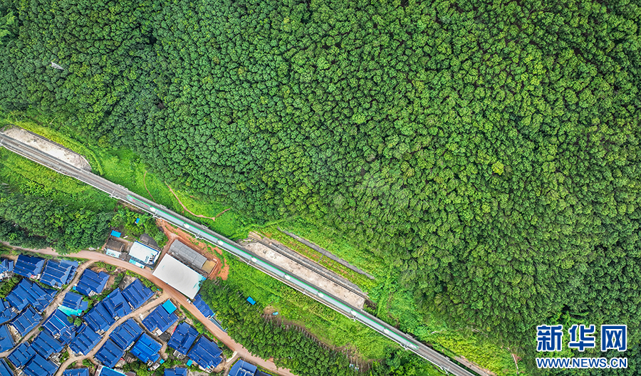 航拍视角下的大龙哈村,中老铁路穿寨而过(资料图)。新华网发(杨奇武 供图)
