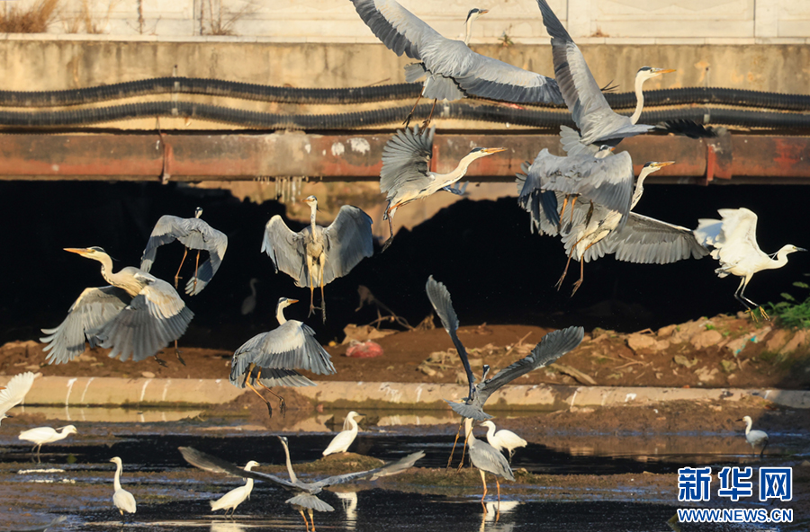 晨曦中,成群的鹭鸟翩翩飞舞(5月22日摄)。新华网发(孙文来 摄)
