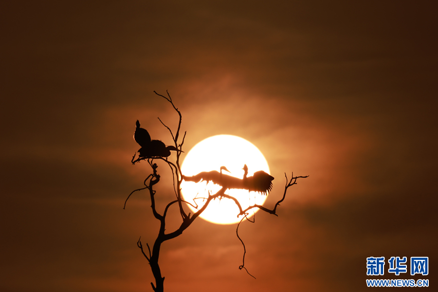 朝阳下,鹭鸟立枝头(5月22日摄)。新华网发(孙文来 摄)