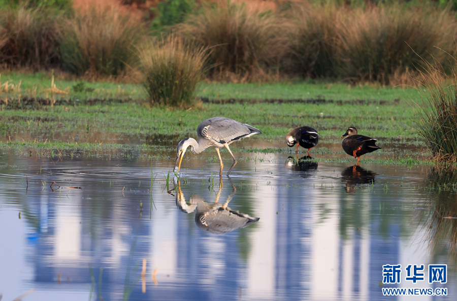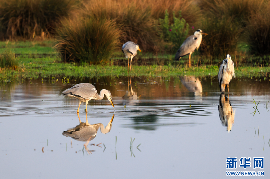 鹭鸟在湿地栖息觅食(5月22日摄)。新华网发(孙文来 摄)