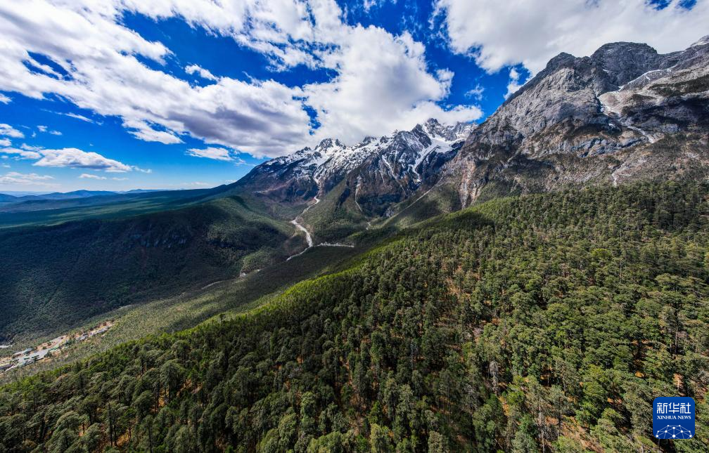 2024年3月28日拍摄的云南丽江森林生物多样性国家野外科学观测研究站云杉坪大样地,远处是玉龙雪山(无人机照片)。新华社记者 陈欣波 摄