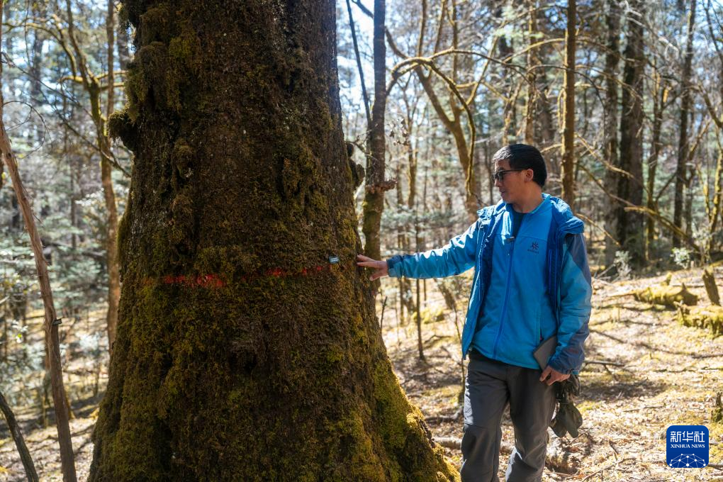 云南丽江森林生物多样性国家野外科学观测研究站工程师范中玉在云杉坪大样地内查看一棵杉树(2024年3月28日摄)。新华社记者 陈欣波 摄