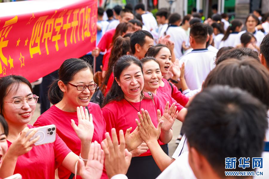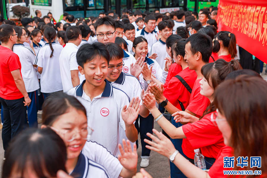 在云南省开远市考点,参加2024年高考的考生们与送考老师击掌(6月7日摄)。新华网发(陶家淇 摄)