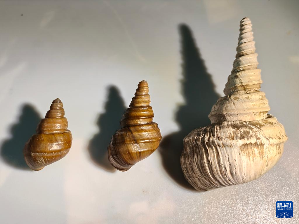 从左到右分别为:2019年采集的光肋环螺蛳、2024年采集的光肋环螺蛳、古代的光肋环螺蛳。受访者供图