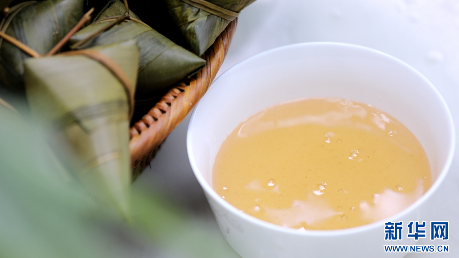 施甸粽子蘸麦芽糖汁很美味(6月4日摄)。新华网发(施甸县融媒体中心供图)